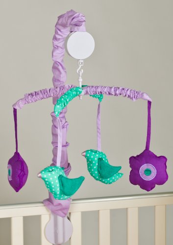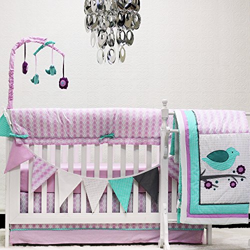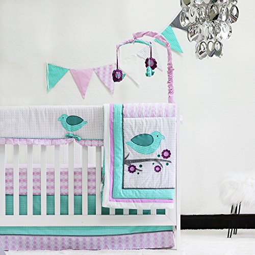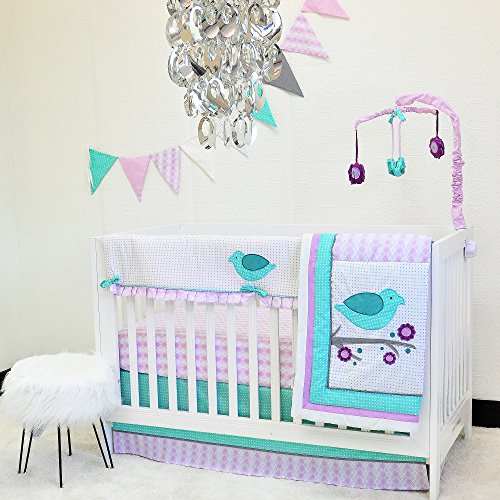 Finally, an adorable set that's not predictably pink! The Love Birds 10 Piece Nursery to Go! in turquoise, purple, and lavender features plump birds and cheery purple flowers.You'll receive a quilt, 2 crib sheets, crib skirt, nappy stacker, mobile, window valance, and 3 wall hangings.Part of the Love Birds collection.