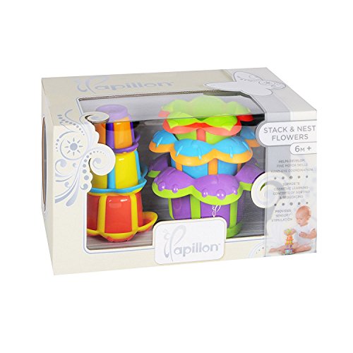 Enjoy hours of fun and learning with the Papillon Stack & Nest Flowers. Stack and nest 6 colorful flower cups with this set. Teach babies the alphabet with letters on the bottom of each cup. With sprinkler holes on the bottom of each cup, this set is ideal for sand, water, outdoor play and bath activities. Place the bottom of the cups on each other to nest and flip them over to stack. This set is recommended for ages 6 months to 4 years.