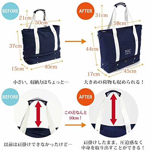 - 主な改良点 ①たっぷり収納できる特大サイズに(横58cm縦44cm厚み17cm)②ハンドル(取っ手部分)を長くして肩にかけたまま中身が取り出せるように改良
