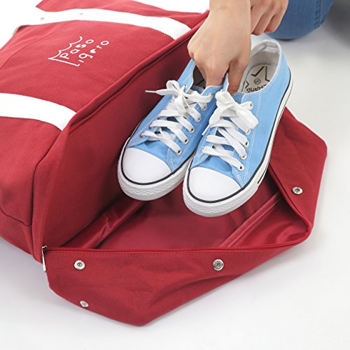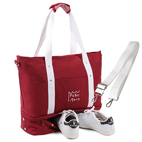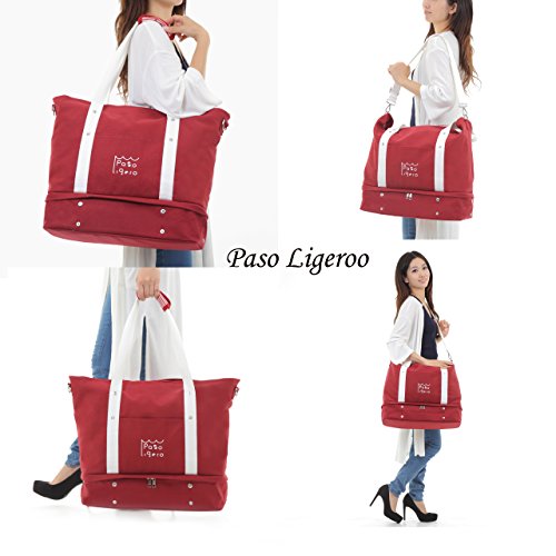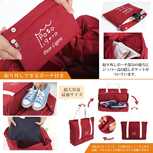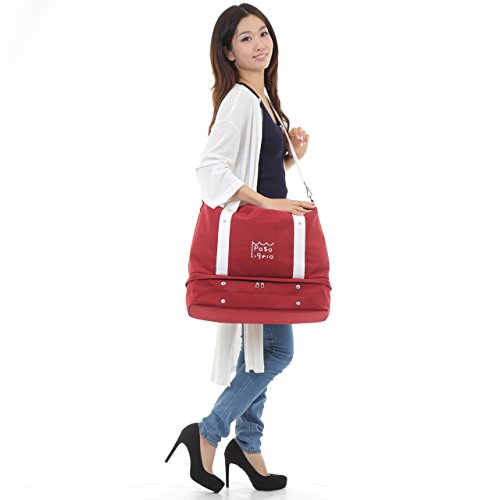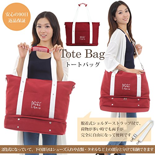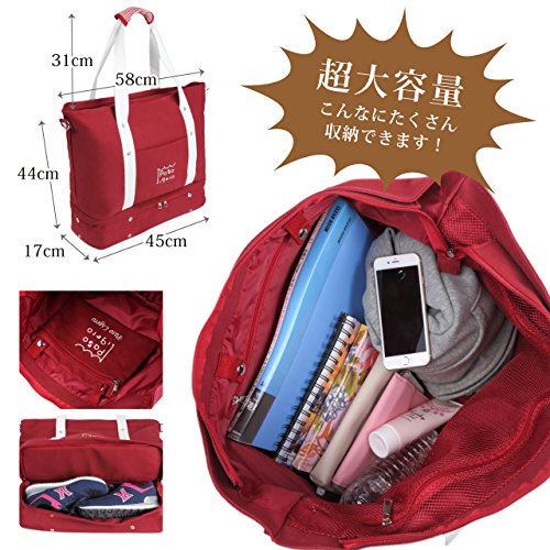 改良版 特大トートバッグ マザーズバッグ キャリーバッグ ショルダーバッグ ジムバッグ メンズ レディース 大容量 2層式 弁当・靴収納 A4サイズ キャンバス ポーチ付き 2WAY 軽量 人気 多機能 (XL size, Wine Red レッド)