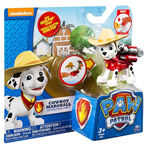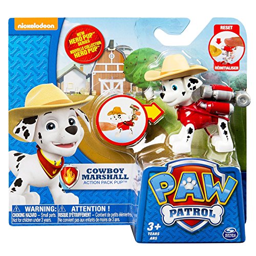 Recreate the pups’ western adventure with Cowboy Marshall! This action-packed, cowboy themed pup is one excited Dalmatian, ready to activate his transforming water cannons. Press Marshall’s dog tag to transform his Pup Pack into a super-soaking water cannon just like in the show! Need some Paw Patrol help? Collect each loveable Paw Patrol pup in the brand new Hero Series and work together as a team! Whether it’s Chase, Marshall, Skye, Zuma, Rocky, or Rubble, each pup has a unique push button transformation. Save the day by re-enacting your favorite missions and prepare to be lassoed into Adventure Bay! Together, your child’s imagination will be lit up with pup inspired rescue missions full of friendship, teamwork and bravery. Because with Paw Patrol, no job is too big, no pup is too small. Bring home Action Pack Pup Cowboy Marshall and collect them all!