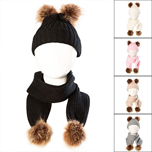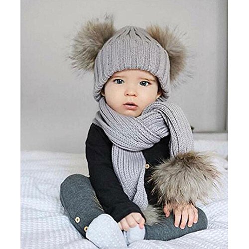 Pawaca ニット帽 ニットキャップ 帽子 子ども ベビー キッズ 女の子 スカーフ 男の子兼用 ポンポン 防寒 お祝い グレー