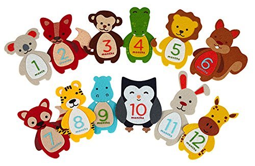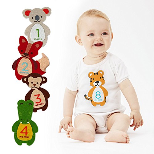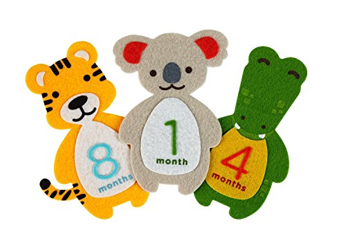Our First Year Felt Belly Stickers are the cutest stickers for recording your child's growth during their first 12 months. These deluxe monthly stickers are designed with layered felt and animal motifs. So easy to use - just stick on your baby's covered belly and snap a photo. 12 adorable animal shaped stickers include a koala, fox, monkey, alligator, lion, squirrel, raccoon, tiger, hippo, penguin, rabbit and giraffe. Perfect for sharing on Instagram, Facebook, Twitter, and other social networks.