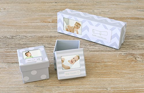 A keepsake box set for your baby's first curl, first tooth and birth certificate;Display your baby's photo on the front of each box;Boxes are printed with three fun patterns and silver stamped text
