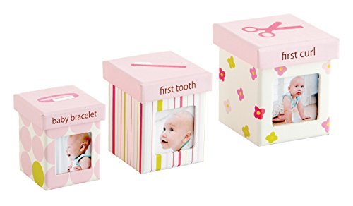 Three colorful little keepsake boxes;A keepsake for your baby's first curl, first tooth, and hospital i.d. Bracelet;Features three colorful fun patterns;The set is tied with a grosgrain ribbon for gift giving;The perfect gift for a new parent