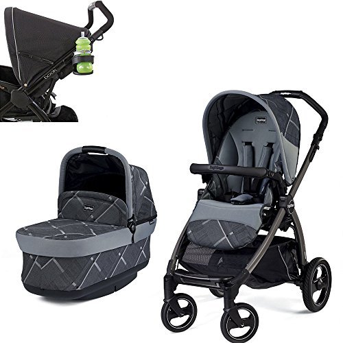 The premium chassis folds inward like a book with just one hand, has an adjustable handlebar covered with Prima Classe material, large polyurethane wheels with ball bearings and remote front wheel swivel control;This innovative bassinet folds compactly on the chassis and stands alone when folded. It includes an adjustable headrest, hood with mesh insert that provides air circulation and a removable mattress that is approved for overnight sleeping;The seat is detachable and reversible creating an easy fold in both positions. The backrest recline slides open for a comfortable resting angle for the baby. The seat folds inward and compactly on the chassis, keeping the upholstery clean and protect;Includes a Peg Perego Stroller Cup Holder in Charcoal;Conveniently snaps onto stroller frame. Designed to keep the cup secure and safe from spills