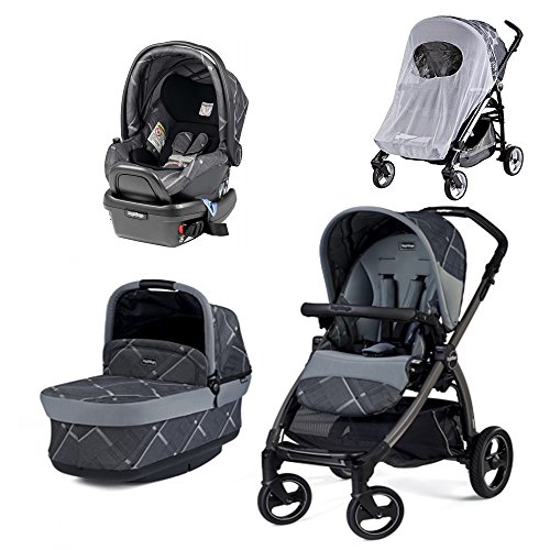 The premium chassis folds inward like a book with just one hand, has an adjustable handlebar covered with Prima Classe material, large polyurethane wheels with ball bearings and remote front wheel swivel control.;This innovative bassinet folds compactly on the chassis and stands alone when folded. It includes an adjustable headrest, hood with mesh insert that provides air circulation and a removable mattress that is approved for overnight sleeping. The seat is detachable and reversible creating an easy fold in both positions. The backrest recline slides open for a comfortable resting angle for the baby. The seat folds inward and compactly on the chassis, keeping the upholstery clean and protected;Rear facing infant car seat for babies 4 to 35 pounds and up to 32 tall, includes a base with an integrated anti-rebound bar;Dual stage cushion system-first stage for 4 pound and up offers extra support on baby's neck and bottom, second stage correctly supports growing baby, both help to keep baby's head properly positioned and are made of our fresco jersey breathable fabric;Includes a Peg Perego Mosquito Netting
