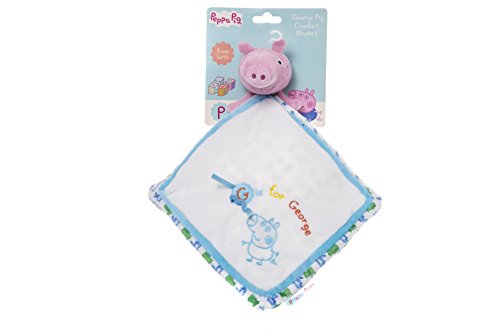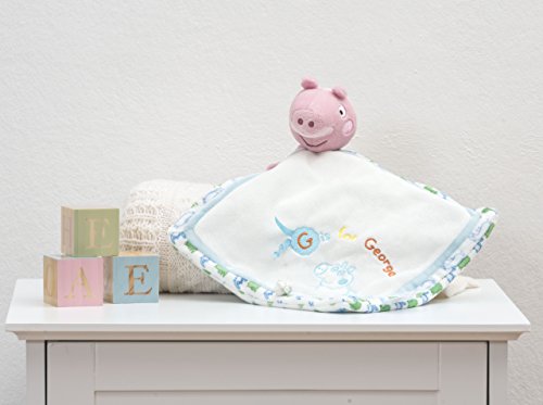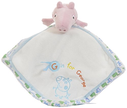 George and Peppa pig are tv characters loved by children everywhere. The George Pig Comforter is made from baby soft plush to ensure it is as as gentle against babies skin as can be. The George Pig Comforter includes blue embroidered detailing on the front which says G is for George as well as a pattern on the reverse side. The George Pig Comforter is 28cm x 28cm in size, this comfort blanket is machine washable at 30 deg C and is suitable from birth. The Peppa Pig comforter encourages baby with sensory play and is the perfect gift for any baby.