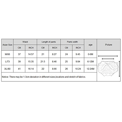 - Lサイズ:パンツ長さ:約21.5cm / 8.46インチ、幅:約25cm / 9.84インチ、ウエスト:約39cm / 15.35インチ(伸縮性あり)、6-12ヶ月間フィット