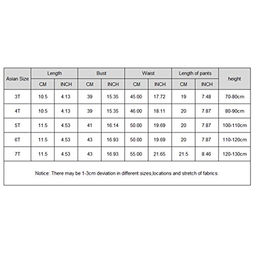 アジアサイズ7T:長さ約11.5cm / 4.53インチ;バスト約43cm / 16.93インチ;ウエスト約55cm / 21.65インチ;パンツの長さ約21.5cm / 8.46インチ、ヒッグ約120-130cm。