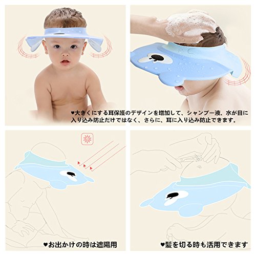 - 【耳/目/口保護】耳保護のデザインを増加して、シャンプー液、水が目に入り込み防止だけではなく、さらに、耳に入り込み防止できます。また、すすぎ湯で息が詰まるのも防止できます。