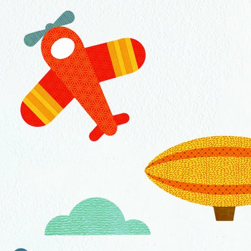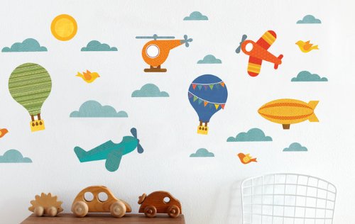 Add a story to any wall with our distinctly patterned, colorful fabric wall decals.;Biodegradable and printed in the U.SA. Lead and phthalate-free, safe for all non-porous surfaces. Packaged flat in an eco-friendly cardboard case. Includes 2 planes, 2 balloons, 1 helicopter, 1 zeppelin, 5 clouds, 2 birds, and 1 sun.;Decals come on 3 12 x 12 sheets. Some assembly required.;The adhesive, vinyl-free decals won't rip, wrinkle or leave residues, and can be repositioned to fit the changing needs of your home (and the changing mind of your child, too).