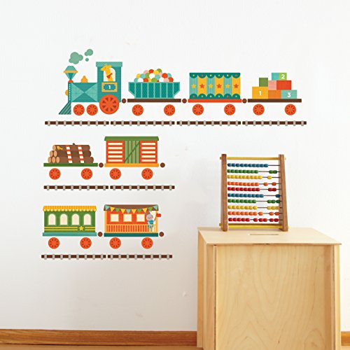 Add a story to any wall with our distinctly patterened, colorful fabric wall decals.;Biodegradable and printed in the U.SA. Lead and phthalate-free, safe for all non-porous surfaces.;Decals come on 3 12 x 12 sheets. Some assembly required.;Lead and phthalate-free, safe for all non-porous surfaces. Packaged flat in an eco-friendly cardboard case. Includes 8 train pieces, 16 train wheels, 8 pieces of train tracks.;The adhesive, vinyl-free decals won't rip, wrinkle or leave residues, and can be repositioned to fit the changing needs of your home (and the changing mind of your child, too).