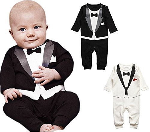 おしゃれなタキシードプリントが可愛いベビー用ロンパースです。