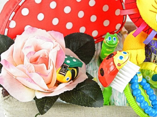パンパースのおむつで作ったお祝いケーキ、バスケットタイプです。 お誕生からすぐに使えるママに大人気のSassyのベビーケアセット、Nubyの哺乳瓶、Lamazeのお人形でデコレートしてあります。 Lamazeはラマーズ法の提唱者ラマーズ博士の思想から生まれたブランドです。 レッグウォーマーは寒い冬ばかりでなく、夏には紫外線から赤ちゃんの足を守ってくれます。 サイズ 幅31cm、奥行き24cm、高さ40cm。 こちらの商品はご注文を頂きましてからの、制作になりますので発送まで2~3日の時間をいただきます。 細かい点を確認させていただきますので、ご注文主様にメールまたは電話にてご連絡させていただきます。