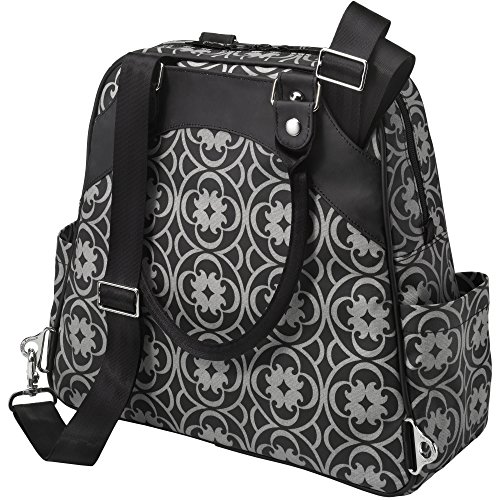 Roomy interior with 3 organizational pockets, 2 bottle pockets and a key clip;4 exterior side bottle pockets;4 exterior front and back magazine pockets, 1 with a cell phone pocket;Removable and washable changing pad;Versatile 2 ways to carry: On shoulder with padded handles or as backpack with straps that store discreetly in back magazine pocket when not in use