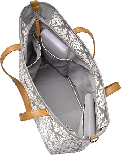 Roomy interior with 6 open pockets, plus 1 with a zipper; Exterior zippered back pocket and Zip-top closure to keep contents secure;Removable, water-resistant and washable baby changing pad, PPB-monogrammed wipes case;Vegan leather shoulder straps and trim, stamped logo, premium metal hardware and protective feet;Attaches easily to most strollers with Valet Stroller Clips (sold separately);Downtown Tote: 13 H x 14 W at base x 6 D (20 W at top opening) Strap drop: 8.5
