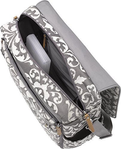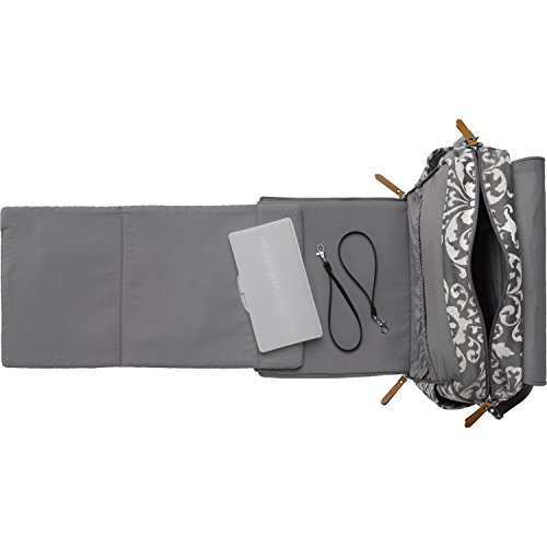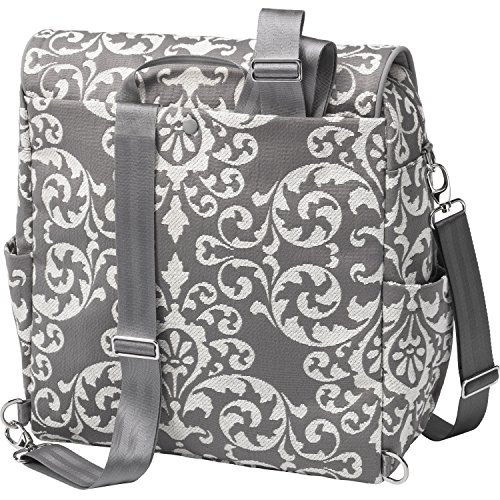 Spacious interior with 5 pockets (2 to stow bottles) and a key clip and wider zip-open top for quicker access to contents;Zip-Out diaper changing station for baby with removable changing pad and pockets for diapers and wipes;Magnetic front flap closure, plus snaps for added security. Exterior back pocket to store backpack straps when not in use;A top grab-handle for easy toting as well as upgraded hardware and vegan leather detailing;Ppb-Monogrammed plastic wipes case, now also includes stroller straps to easily attach bag to most strollers