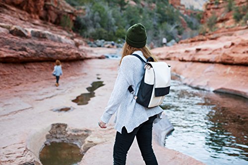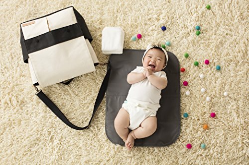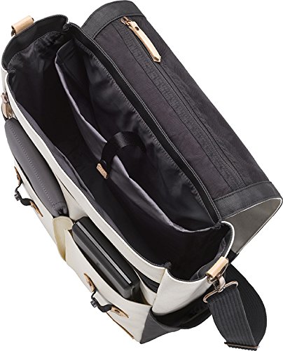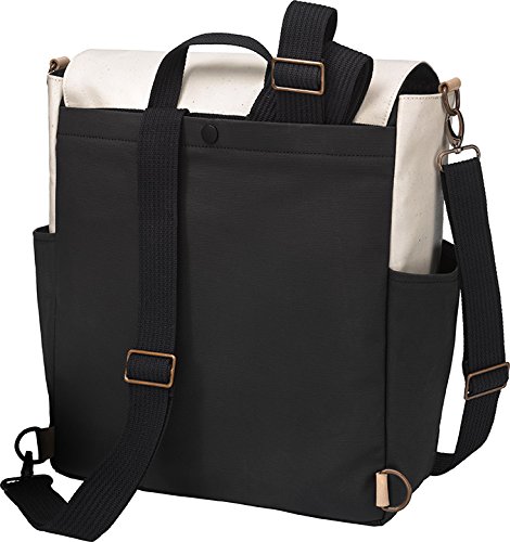 Roomy interior with 2 open pockets and 1 snap-close laptop pocket;2 side exterior bottle pockets, 2 open front pockets, 1 zippered front pocket;Front flap with secure snap closure, Zippered mesh pocket under flap;Removable, water-resistant and washable baby changing pad, PPB-monogrammed wipes case;Genuine leather trim, stamped logo, premium antique copper-colored metal hardware, Woven backpack straps, grab handle and detachable cross-body strap