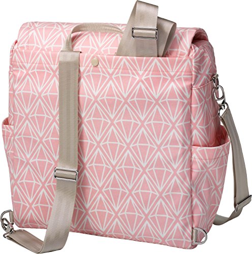 Spacious interior with 5 pockets (2 to stow bottles), a key clip and 2 exterior bottle pockets;Wider zip-open top for quicker access to contents and a top grab-handle for easy toting;Zip-out diaper changing station for baby with removable changing pad and pockets for diapers and wipes. Upgraded hardware and vegan leather detailing;Magnetic front flap closure, plus snaps for added security. Exterior back pocket to store backpack straps when not in use;PPB-monogrammed plastic wipes case and now also includes stroller straps to easily attach bag to most strollers