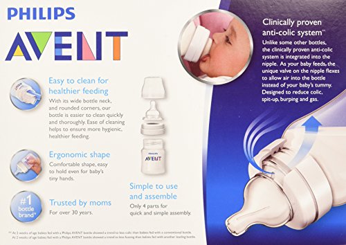 Clinically proven to reduce colic and discomfort;Anti-colic valve integrated into the nipple vents air into the bottle and away from baby's tummy. Designed to reduce gas and fussiness;Only 3 parts for quick and easy cleaning and simple assembly;A range of flow rates are available for your growing baby. This bottle includes a 0Month+ Newborn nipple;Trusted by millions of moms since 1984, Philips Avent is the #1 brand recommended by moms worldwide;BPA-Free;Clinically proven anti-colic system vents air into bottle instead of your baby's tummy;Clinically proven to significantly reduce fussing;Few parts for quick, simple assembly;Easy to clean for healthier feeding