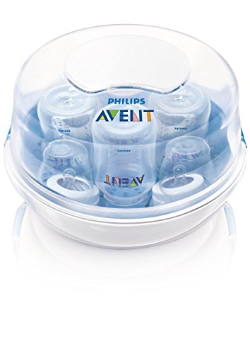 Philips AVENT SCF281/05 Microwave Steam Sterilizer protects your baby from harmful bacteria, operating at a higher temperature than dishwashers. Sterilizing up to 4 Natural or Classic bottles at a time, it kills 99.9% of harmful germs. This lightweight, compact sterilizer is the perfect size for traveling. Stay-cool safety grips allow for safe handling and make it easy to sterilize breast pumps, bottles, cups and more while at home or traveling. The Microwave Steam Sterilizer uses the power of your microwave to create natural steam. Just add water and place in the microwave for 2 minutes. Safety clips keep the lid securely closed and side grips stay cooler for safe handling. At full capacity, the sterilizer holds up to 4 9 ounce or 2 11 ounce Philips AVENT Classic or Natural bottles. Its interior rack can also support 2 Philips AVENT Breast Pumps (non-electrical components only) and up to 4 breast milk storage cups and lids. You can also use it to sterilize pacifiers, non-metal utensils, and other microwave-safe baby items. Measuring 6.5 inches by 11 inches, the sterilizer fits in most microwave ovens, is BPA free and is backed by a 1-year limited warranty.