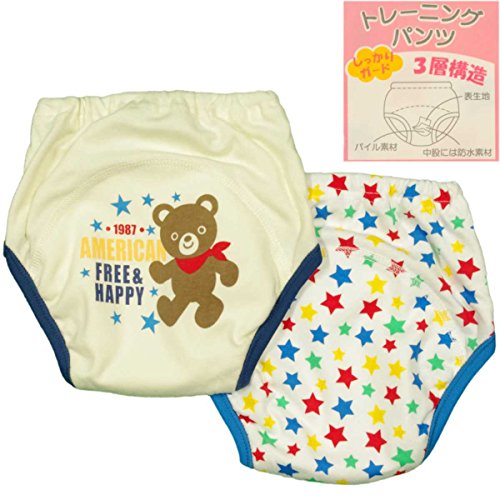 カラー : ホワイト-クリーム / 男の子ベビートレーニングパンツ2枚組 / ・ 星柄・ヒップに英字プリントとくまちゃん柄の2枚セット / ・ ウェストにゴム入 / ・ 履き口パイピング加工 / ・ 股部分は表生地・中股に防水素材・パイル素材の3層構造でしっかりガード / ・ 内側にネームタグ付き / ・ おむつはずし・トイレトレーニングに / / 表地 : 綿 100% / 裏股部分 : 綿 80% ポリエステル 20% / (ポリウレタンコーティング) / パイピング : ポリエステル 98% ポリウレタン 2%