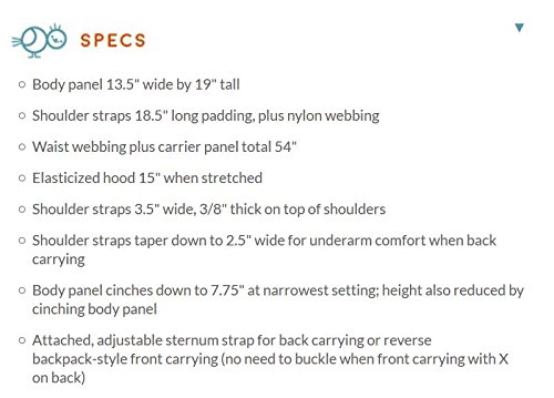 No infant insert necessary;Four carryings positions: Face in or out, hip, or back;Newborn through toddler (8 40 pounds);100% cotton fabric;Adjustable width base for a perfect fit