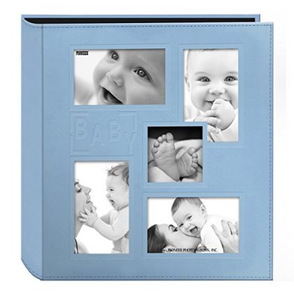 This photo album holds 240 4-inch by 6-inch photos in optically clear plastic pockets. It features a collage frame front with embossed 'Baby' text. The album is bookstyle bound in a baby blue sewn leatherette cover. The unique five pocket page layout design allows for both horizontal and vertical prints to be displayed on the same page.