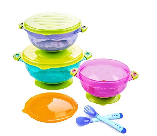 THREE SIZE THREE COLOR - Come with 3 size and color FDA CERTIFIED(Please check the TEST RESPORT on the left image list) and BPA FREE strong suction bowl with secure locking lids and a fork and spoon;WHITE HOT SAFETY FROK AND SPOON - Patented white hot system: Spoon tip turns white when baby's food is too hot (approximately 102 degrees F or 39 degrees C and above);YOUR KIDS MAYBE HATE THIS PRODUCT, BUT YOU WILL LIKE IT - Countless tests to ensure our bowls have the best suction. Superior suction base that makes it very difficult for a baby or toddler to spill their food. No more meal time mess.;PERFECT FOR OUTDOOR TIME - The snap tight lids make the bowls great for food storage and can be stacked on top of each other. Our bowl set makes it easy to take food with you wherever you go;100% SATISFACTION GUARANTEE - Plai offers a 30-Day, money-back guarantee, you can use this product for up to a month, and if you don't like it, you can return it for a full refund.