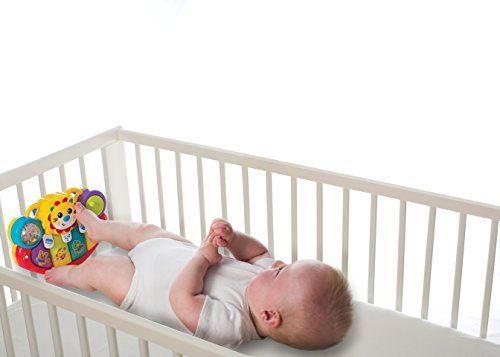 4 light-up, musical keys, 7 learning activities, spinning and turning wheel and paddle, includes "try me" function, two straps for easy attachment to crib or stroller, ages 6 + months.