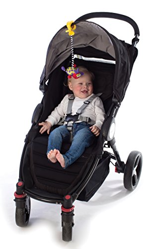 Clip easily attaches to prams, strollers or in the car;Vibrant colors and patterns encourage visual perception;Dances and wiggles when pulled
