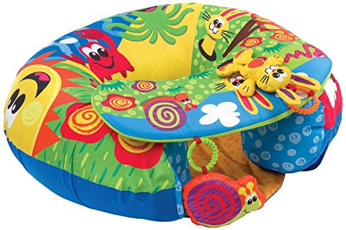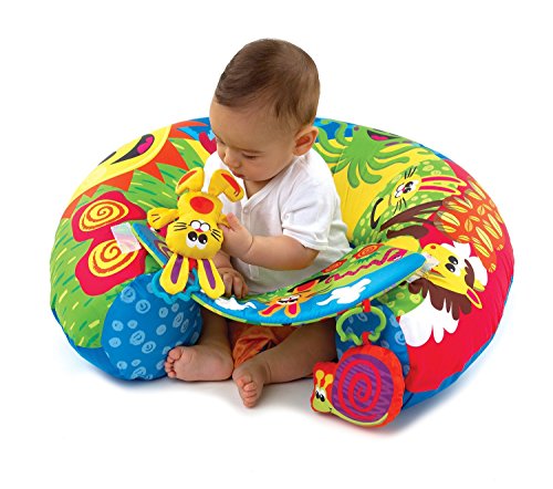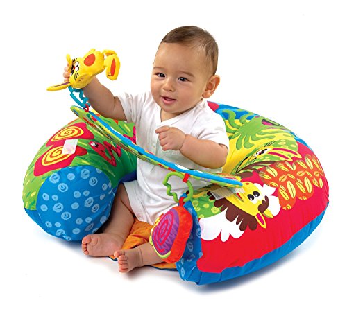 The unique design of the Sit 'n' Play assists babies learning to sit up independently, by offering a soft inflatable ring for them to sit in. A detachable tray can be added to the front of the ring for baby to play with the detachable hanging toys. Each toy offers a unique feature of a squeaker or rattle to encourage auditory stimulation.