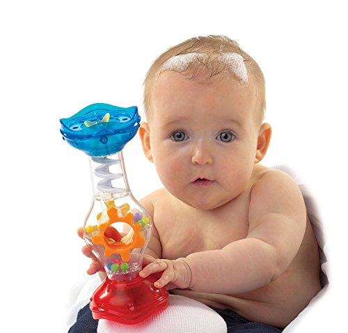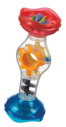 Vibrant, contrasting colors provide visual stimulation and encourage eye-tracking skills as the water creates movement inside the toy. Pour water into the top and watch the water wheel spin, while making the colorful fish beads and balls dance, and then the black and white spiral ramp spin.