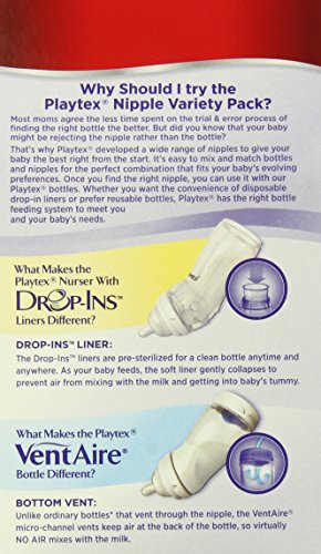 Only Playtex lets you skip the trial and error process to give your baby the best feeding right from the start;Try a wide range of 4 nipple shapes in different sizes and textures to match your baby's unique preference;Kit includes a natural latch nipple, breast like nipple, angled nipple, and full sized nipple;All nipples feature a wide raised textured area designed to promote proper latch on for easy switching between breast and bottle;Work with all Playtex bottles to mix and match to find the perfect combination to meet your baby's unique preference