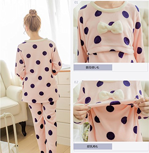 (プラムリバー)PlumRiver マタニティ パジャマ ルームウェア 上下セット 部屋着 授乳服 授乳口付き ウェア 産後 セットアップ あったか もこもこ ボア ドット リボン ピンク Lサイズ