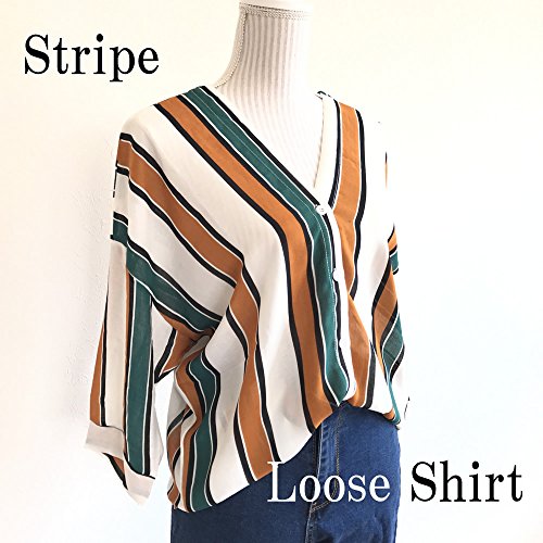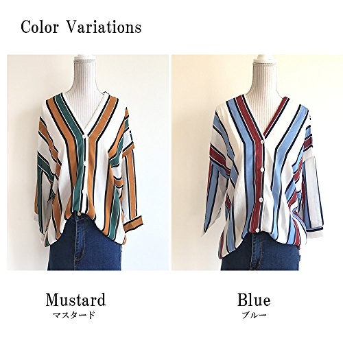 Plus Nao(プラスナオ) ボーダー トップス シャツ Vネック スキッパー Vネック 抜け感 トライプ ブラウス 七分袖 F マスタード