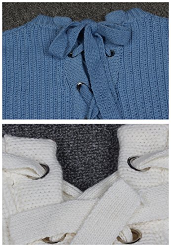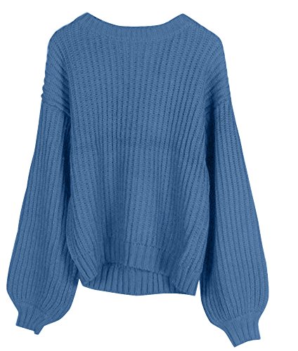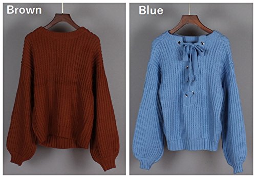 Plus Nao(プラスナオ) ニット セーター プルオーバー ラウンドネック クルーネック 長袖 バルーンスリーブ レースアップ レディース トップ - ブルー