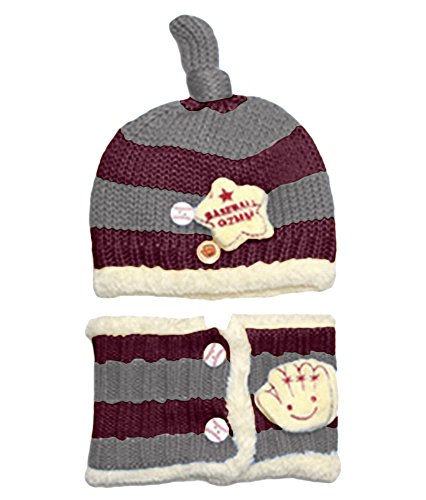 Plus Nao(プラスナオ) 子供用ニット帽+マフラー・ボタン付きネックウォーマー・ニットキャップ・キッズ・ベビー・子ども・男の子・女の子 F グレー+ワイン