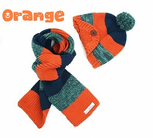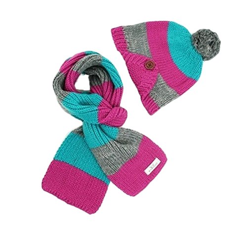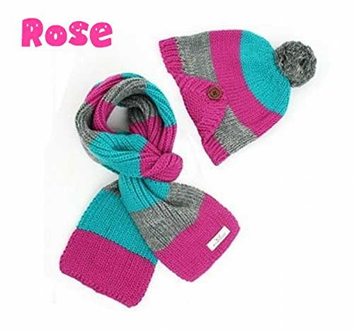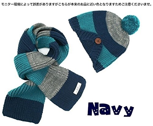Plus Nao(プラスナオ) 子供用 ニット帽 ボンボン付き ボーダー ボタン付き マフラー付き 2点セット セットアップ ニットキャップ キッズ ジ - ローズ