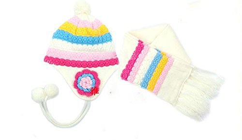 Plus Nao(プラスナオ) 子供用 ニット帽&マフラー 2点セット 耳当て付き ポンポン付き カラフル バイカラー ベビー キッズ 男の子 女の子 - ホワイト