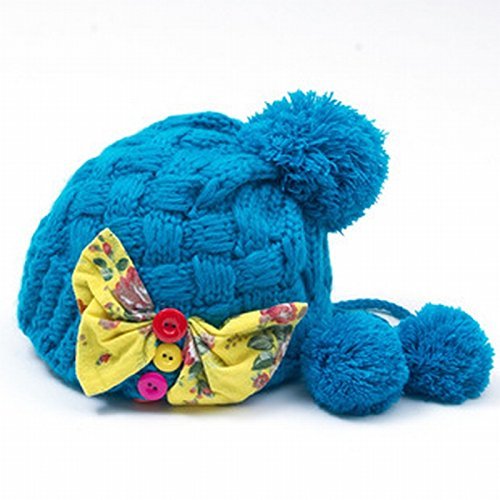 Plus Nao(プラスナオ) 子供用 ニット帽 ボンボン&リボン付き ニットキャップ キッズ ジュニア 女の子 冬帽子 - ブルー