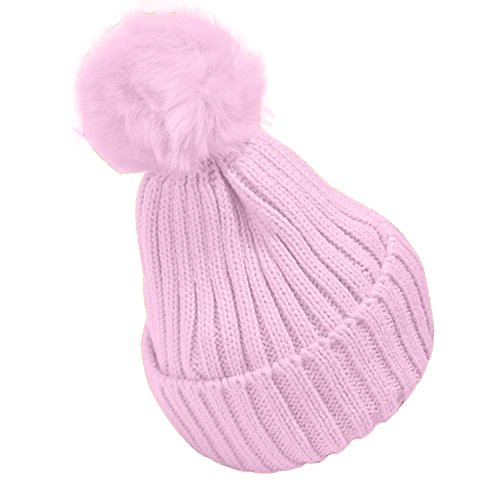Plus Nao(プラスナオ) 子供用 ニット帽 ファーボンボン付き リブニット ワッチ ビーニー ニットキャップ キッズ ジュニア シンプル 無地 女 - ピンク