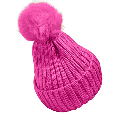Plus Nao(プラスナオ) 子供用 ニット帽 ファーボンボン付き リブニット ワッチ ビーニー ニットキャップ キッズ ジュニア シンプル 無地 女 - ローズ