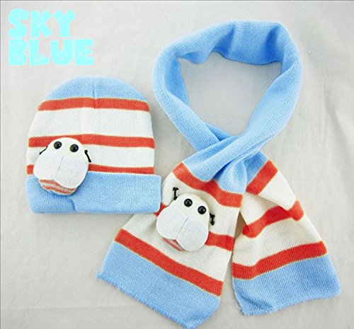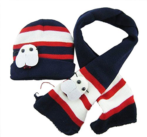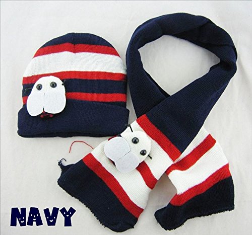 Plus Nao(プラスナオ) 子供用 ニット帽&マフラー 2点セット セットアップ てんとう虫 マスコット付き ボーダー 水玉 ビーニー ベビー キッ - ネイビー
