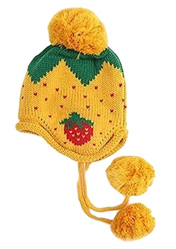 Plus Nao(プラスナオ) 子供用 帽子 ニット帽 耳あて付き帽子 ボンボン&顎ひも付き 模様編み イチゴ模様 ニットキャップ キッズ 冬帽子 - イエロー