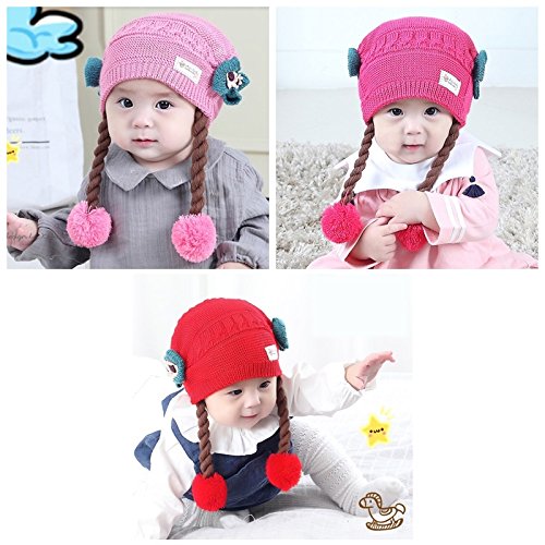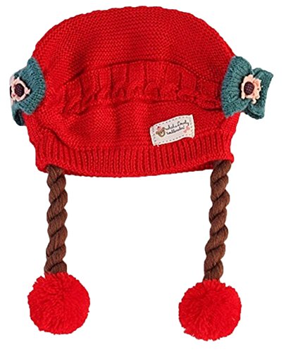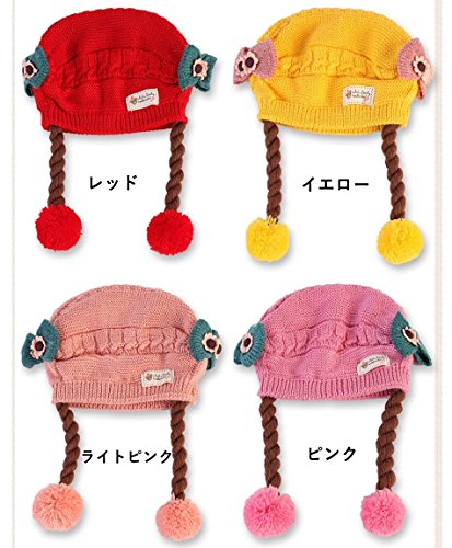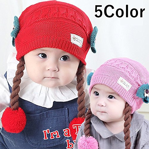 Plus Nao(プラスナオ) ニット帽 ニットキャップ ベビー帽子 ぼうし 赤ちゃん用 子供用 つけ毛付き ウィッグ付き 三つ編み付き おさげ付き - レッド