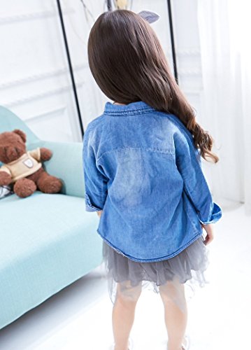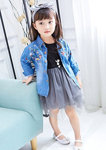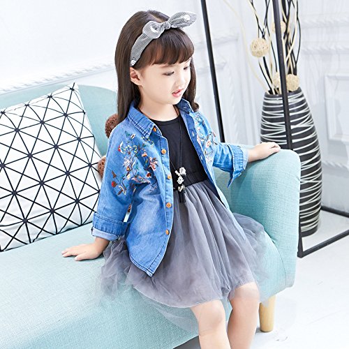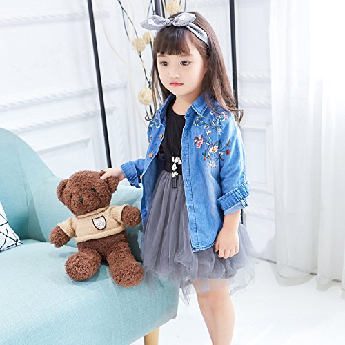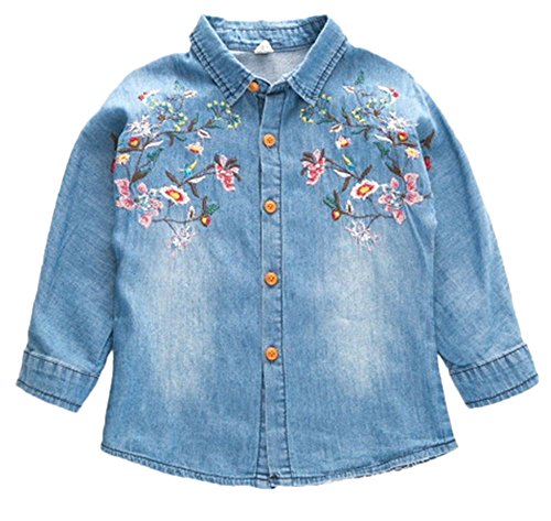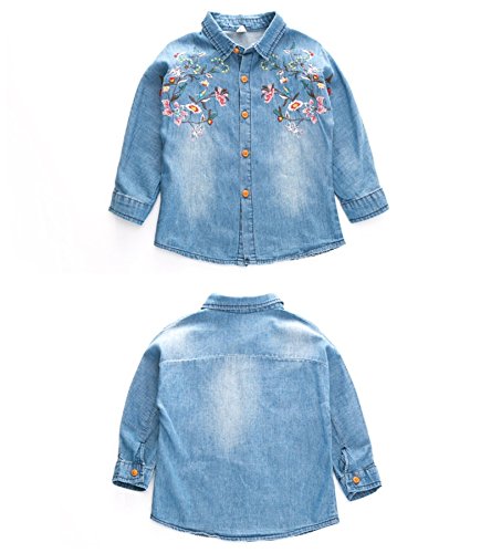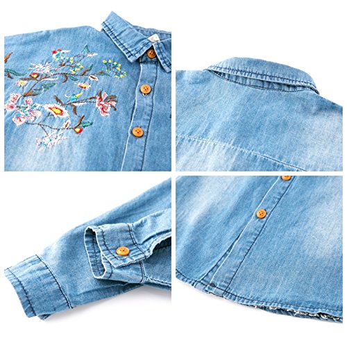 Plus Nao(プラスナオ) ダンガリーシャツ タンガリーシャツ デニムシャツ デニムブラウス ジーンズ 長袖 花柄刺繍 トップス 子供服 秋冬 女 - 140