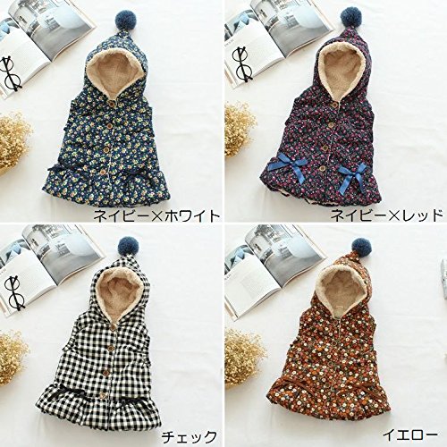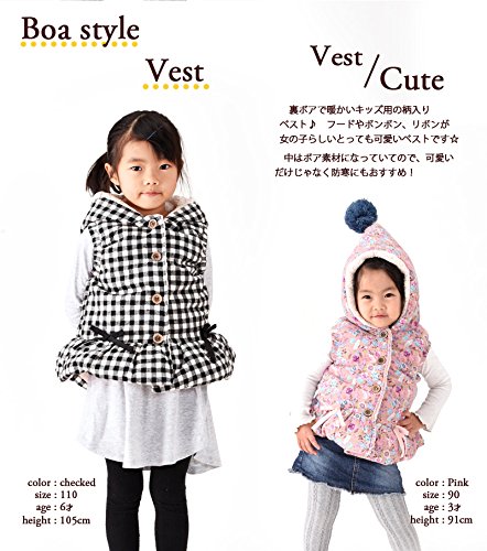子供用フード付き ベスト 裏ボア ボンボン付き 前ボタン リボン チェック柄 花柄 ふわふわ あったか カジュアル 可愛い ベビー キッズ 女児 女の子 ジュニア 90 100 110 120 130