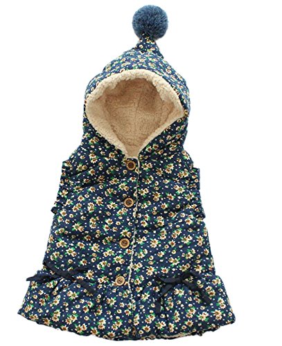 Plus Nao(プラスナオ) 子供用フード付きベスト 裏ボア ボンボン付き 前ボタン リボン チェック柄 花柄 ふわふわ あったか カジュアル 可愛 140 ネイビー×ホワイト